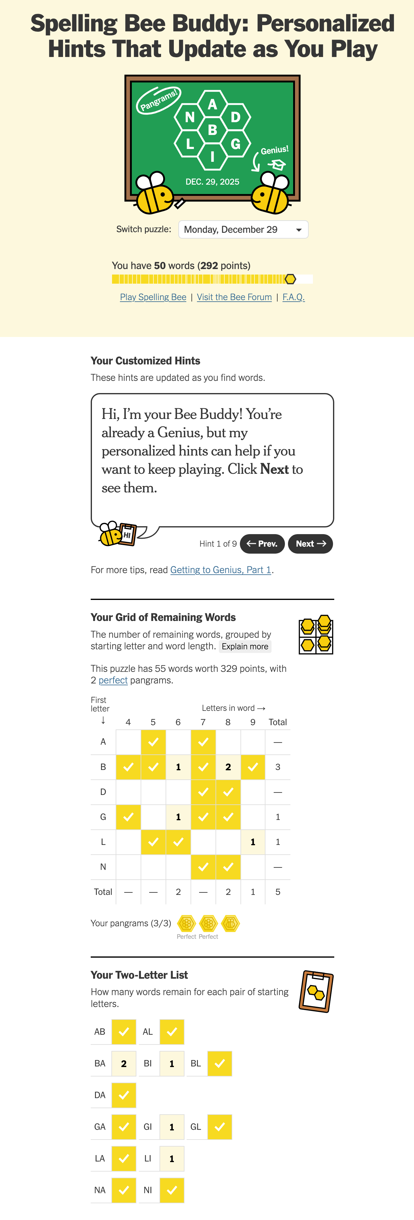 The NYT Spelling Bee is an addictive word puzzle that I enjoy playing. When I get stumped for long enough before reaching 'Genius' level, I reach for the Spelling Bee Buddy—a companion tool that interactively gives hints about starting letters, word lengths, and a comparison of your words with other Buddy users. These clues are normally enough to help me reach 'Genius' and rarely even 'Queen Bee'. Flipping between the tabs for the game and Buddy got me thinking that it would be nice to have both on the same page.